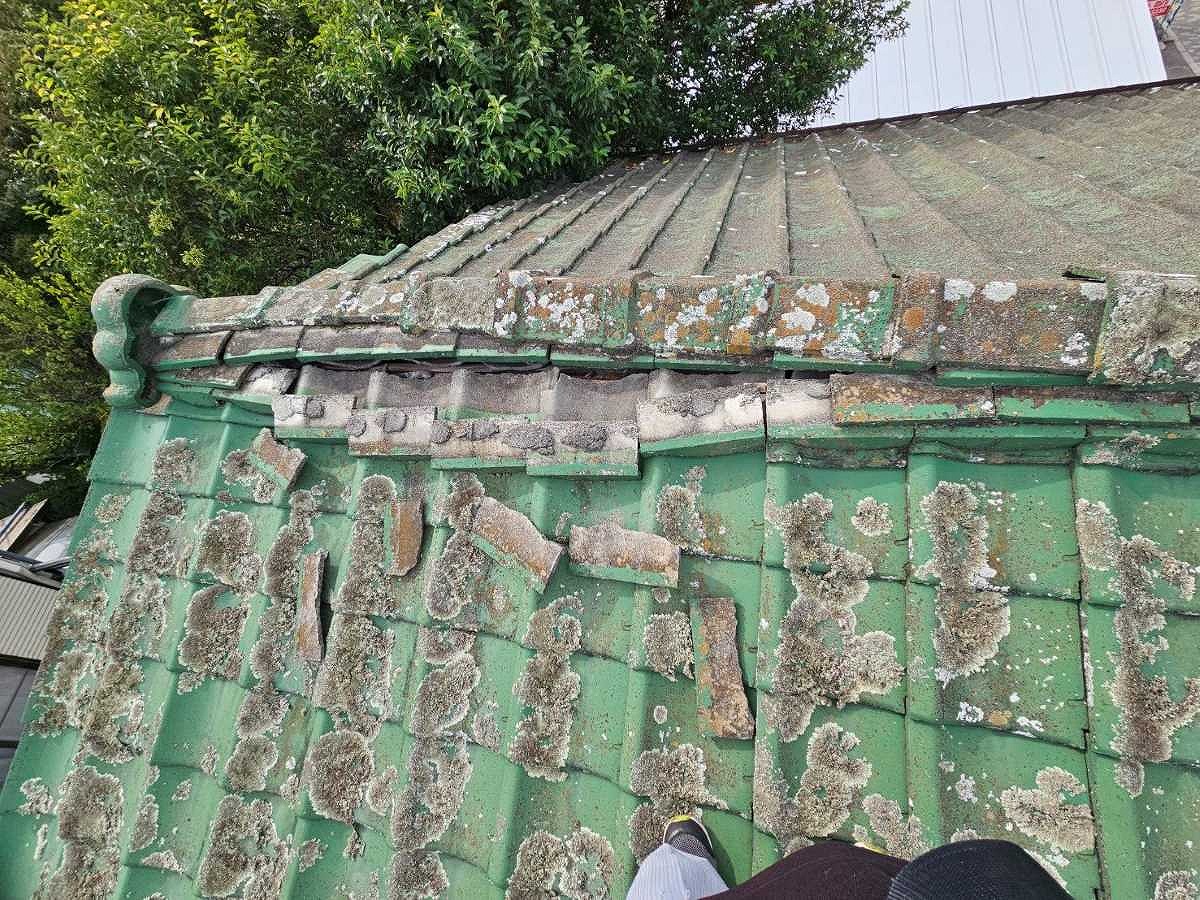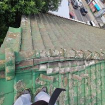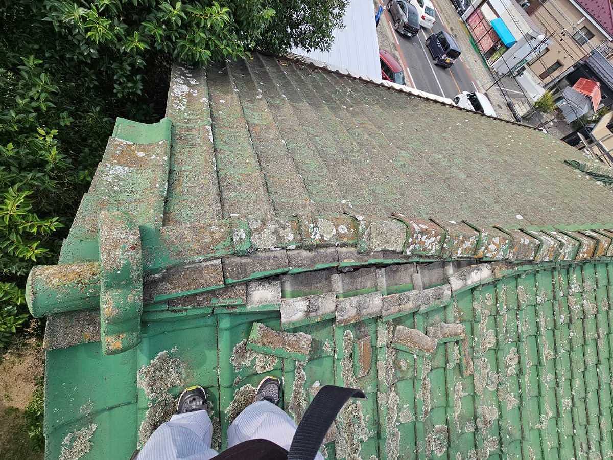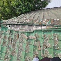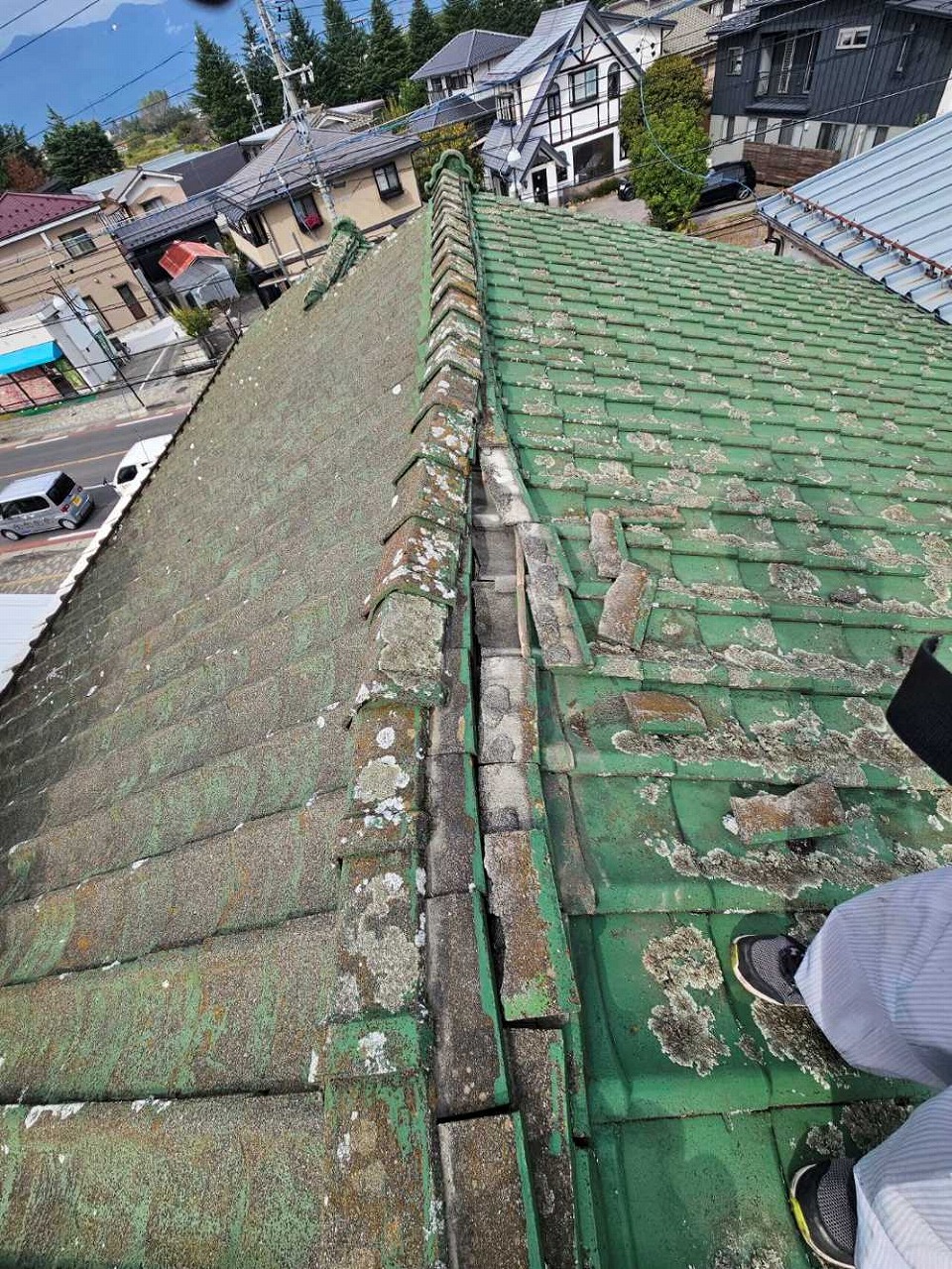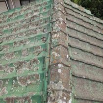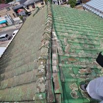 - 屋根にのぼり点検しましたが、セメント瓦が劣化しており棟瓦のずれがあり屋根塗装では対応できないため、耐震性能の向上もあるので軽いカラー鉄板に葺き替えるよう提案しました。